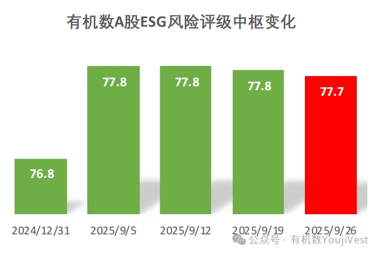 本周共有294只A股的有机数ESG综合风险评级被调升,258只A股的评级被下调。ESG综合风险评级为A级(含)以上的个股占比稳定在59.25%,B级(含)以下的占比升至7.02%。总体A股评级中枢值微跌至 77.7。