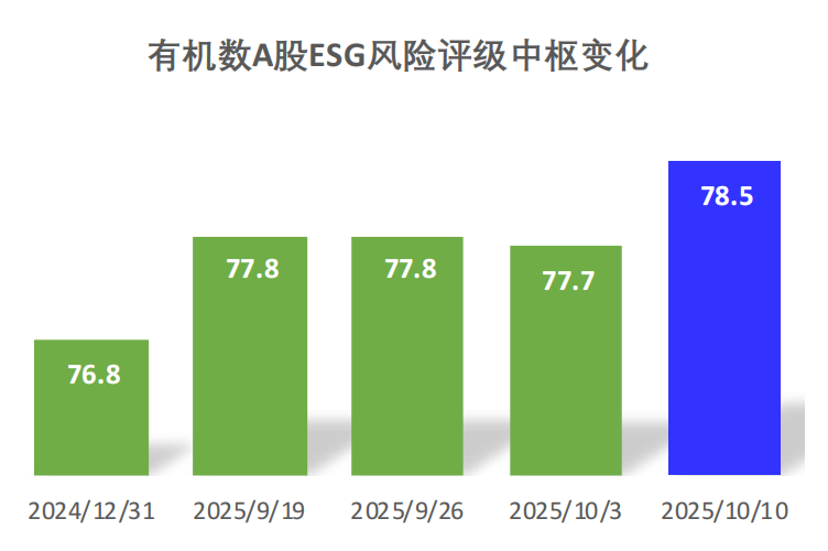 本周共有293只A股的有机数ESG综合风险评级被调升,仅66只A股的评级被下调。ESG综合风险评级为A级(含)以上的个股占比提升至60.85%,B级(含)以下的占比降低至6.16%。总体A股评级中枢值跃升至 78.5。