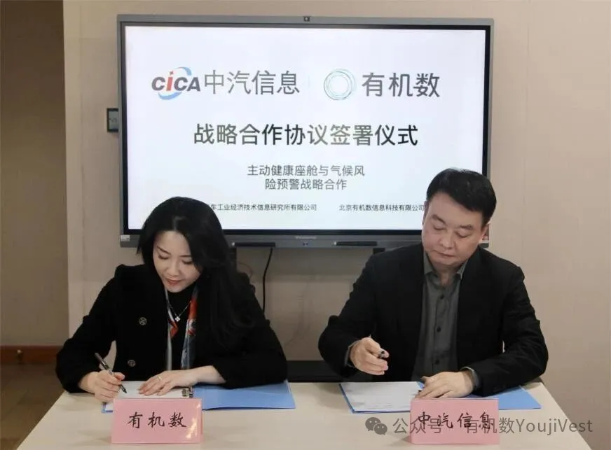 近日,北京有机数信息科技有限公司(简称“有机数”)与中国汽车工业经济技术信息研究所有限公司(简称“中汽信息所”,中国汽车工业协会下属核心机构)正式签署战略合作协议。双方将以行业标准为引领、以数据技术为核心,共同推动主动健康座舱与智能灾害预警技术的标准化落地与规模化应用,为中国汽车产业高质量发展注入全新动能。
